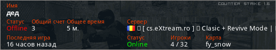 Играет на Counter Strike 1.6 сервере. Страна: РумынияПервый раз замечен 18:59 22.03.2026
