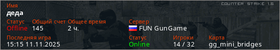 Играет на Counter Strike 1.6 сервере. Страна: РоссияПервый раз замечен 12:05 10.09.2025