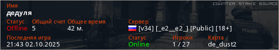 Играет на Counter Strike Source сервере. Страна: РоссияПервый раз замечен 22:35 29.11.2023