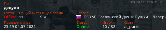 Играет на Counter Strike 1.6 сервере. Страна: РоссияПервый раз замечен 20:28 04.09.2024