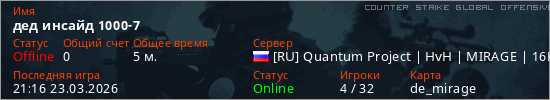 Играет на Counter Strike Global Offensive сервере. Страна: РоссияПервый раз замечен 21:14 23.03.2026