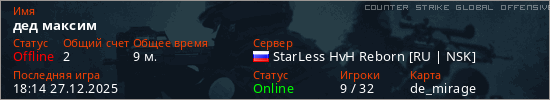 Играет на Counter Strike Global Offensive сервере. Страна: РоссияПервый раз замечен 16:00 26.12.2025
