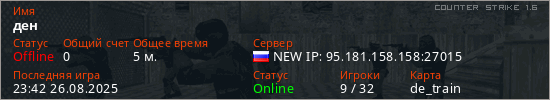 Играет на Counter Strike 1.6 сервере. Страна: РоссияПервый раз замечен 23:36 26.08.2025