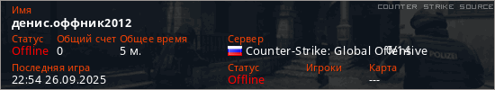 Играет на Counter Strike Source сервере. Страна: РоссияПервый раз замечен 22:52 26.09.2025