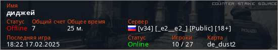 Играет на Counter Strike Source сервере. Страна: РоссияПервый раз замечен 16:31 09.07.2024