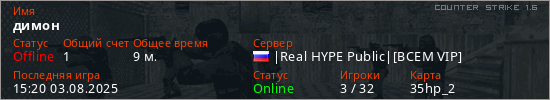 Играет на Counter Strike 1.6 сервере. Страна: РоссияПервый раз замечен 21:55 18.06.2025