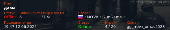 Играет на Counter Strike Source сервере. Страна: РоссияПервый раз замечен 19:13 15.04.2023