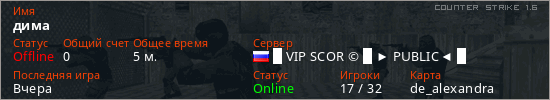 Играет на Counter Strike 1.6 сервере. Страна: РоссияПервый раз замечен 18:22 11.03.2026