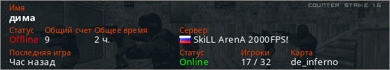 Играет на Counter Strike 1.6 сервере. Страна: РоссияПервый раз замечен 06:05 15.07.2022
