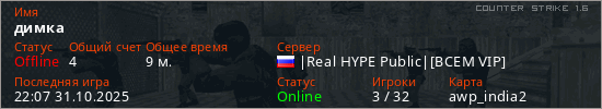Играет на Counter Strike 1.6 сервере. Страна: РоссияПервый раз замечен 16:19 16.05.2025