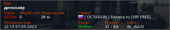 Играет на Counter Strike Source сервере. Страна: РоссияПервый раз замечен 21:16 07.05.2023