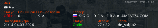 Играет на Counter Strike 1.6 сервере. Страна: РоссияПервый раз замечен 21:02 03.03.2026