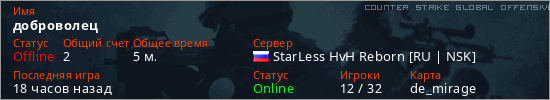 Играет на Counter Strike Global Offensive сервере. Страна: РоссияПервый раз замечен 19:56 11.03.2026