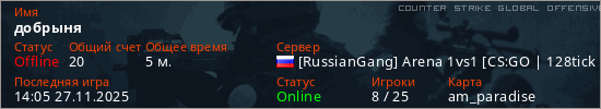 Играет на Counter Strike Global Offensive сервере. Страна: РоссияПервый раз замечен 13:27 27.11.2025
