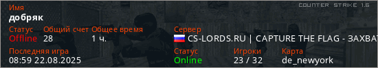 Играет на Counter Strike 1.6 сервере. Страна: РоссияПервый раз замечен 21:07 14.05.2024
