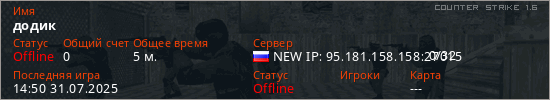 Играет на Counter Strike 1.6 сервере. Страна: РоссияПервый раз замечен 14:41 31.07.2025