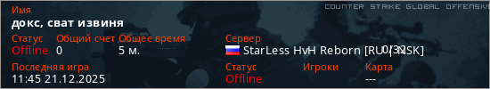 Играет на Counter Strike Global Offensive сервере. Страна: РоссияПервый раз замечен 11:16 21.12.2025
