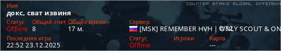 Играет на Counter Strike Global Offensive сервере. Страна: РоссияПервый раз замечен 20:43 21.12.2025