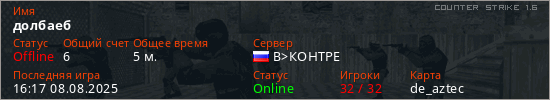 Играет на Counter Strike 1.6 сервере. Страна: РоссияПервый раз замечен 16:12 08.08.2025