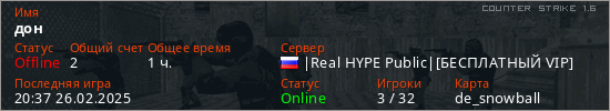 Играет на Counter Strike 1.6 сервере. Страна: РоссияПервый раз замечен 20:03 21.02.2025