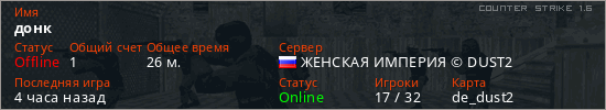 Последний раз был в сети Час назад Игрок с таким ником замечен на 28 серверах