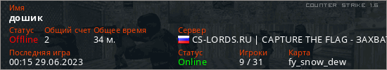 Играет на Counter Strike 1.6 сервере. Страна: РоссияПервый раз замечен 00:17 27.01.2023