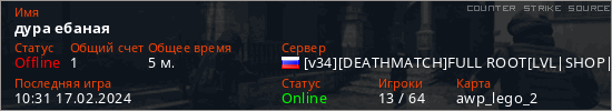 Играет на Counter Strike Source сервере. Страна: РоссияПервый раз замечен 09:23 17.02.2024