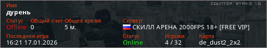 Играет на Counter Strike 1.6 сервере. Страна: РоссияПервый раз замечен 15:47 17.01.2026