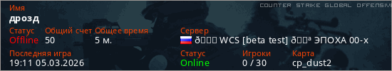 Играет на Counter Strike Global Offensive сервере. Страна: РоссияПервый раз замечен 19:01 05.03.2026