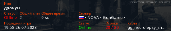 Играет на Counter Strike Source сервере. Страна: РоссияПервый раз замечен 19:00 08.05.2023