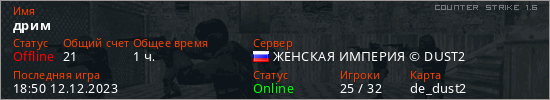 Играет на Counter Strike 1.6 сервере. Страна: РоссияПервый раз замечен 08:24 15.05.2022