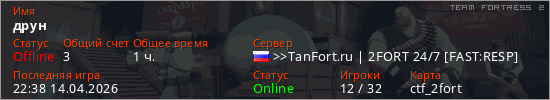 Играет на Team Fortress 2 сервере. Страна: РоссияПервый раз замечен 16:02 14.03.2026