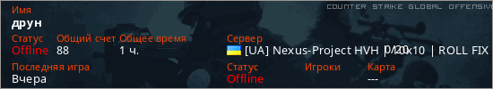 Играет на Counter Strike Global Offensive сервере. Страна: УкраинаПервый раз замечен 19:36 04.01.2026