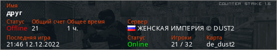 Последний раз был в сети 21:46 12.12.2022 Игрок с таким ником замечен на 22 серверах
