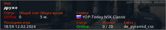 Играет на Counter Strike Source сервере. Страна: РоссияПервый раз замечен 18:51 12.02.2024