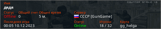 Играет на Counter Strike 1.6 сервере. Страна: РоссияПервый раз замечен 00:03 10.12.2023