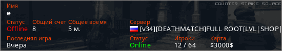 Играет на Counter Strike Source сервере. Страна: РоссияПервый раз замечен 09:38 09.12.2025