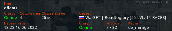 Играет на Counter Strike 1.6 сервере. Страна: РоссияПервый раз замечен 18:28 16.06.2022