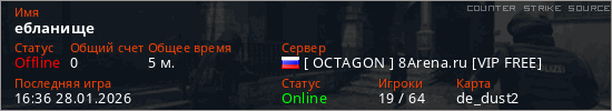 Играет на Counter Strike Source сервере. Страна: РоссияПервый раз замечен 16:32 28.01.2026