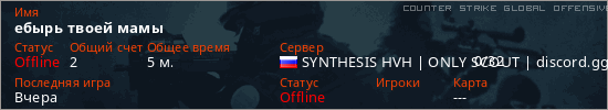 Играет на Counter Strike Global Offensive сервере. Страна: РоссияПервый раз замечен 12:41 20.04.2026