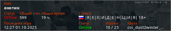 Последний раз был в сети 12:27 01.10.2025 Игрок с таким ником замечен на 6 серверах