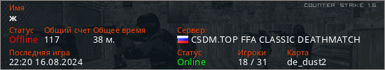 Играет на Counter Strike 1.6 сервере. Страна: РоссияПервый раз замечен 22:05 07.01.2023