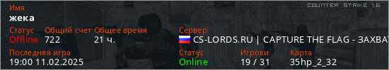 Играет на Counter Strike 1.6 сервере. Страна: РоссияПервый раз замечен 13:30 03.09.2020