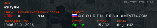 Играет на Counter Strike 1.6 сервере. Страна: РоссияПервый раз замечен 23:09 22.12.2025