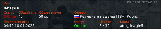 Играет на Counter Strike 1.6 сервере. Страна: РоссияПервый раз замечен 20:57 17.01.2023