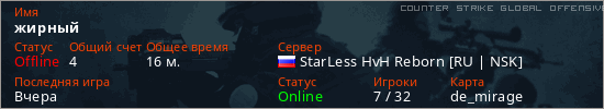Играет на Counter Strike Global Offensive сервере. Страна: РоссияПервый раз замечен 19:41 23.11.2025