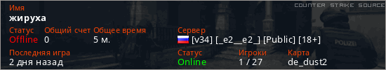 Играет на Counter Strike Source сервере. Страна: РоссияПервый раз замечен 21:34 02.01.2026