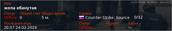 Играет на Counter Strike Source сервере. Страна: РоссияПервый раз замечен 20:19 24.02.2026