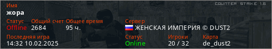 Играет на Counter Strike 1.6 сервере. Страна: РоссияПервый раз замечен 15:45 10.03.2022