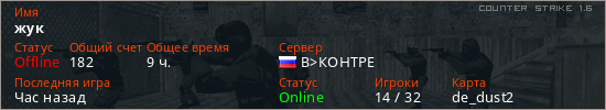 Играет на Counter Strike 1.6 сервере. Страна: РоссияПервый раз замечен 22:01 21.12.2019